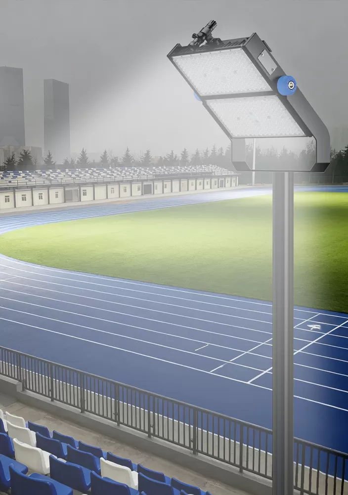 Ang mga karaniwang patlang na pang-atletiko ay may apat na sulok na layout na may 25 hanggang 40-meter-high light poste. Ang mga poste na ito ay nilagyan ng mataas na lakas na LED na mga ilaw ng baha na nagpapakita ng ilaw mula sa iba't ibang mga anggulo sa buong track at panloob na patlangan d. Upang mapabuti ang patayong pag-iilaw at protektahan ang mga atleta mula sa mga anino, mas mala-mount na panig na mga auxiliary light poste na 10-15 metro ang taas ay maaaring idagdag sa mga lugar ng paglukso ng kaganapan sa patlang (mahabang pagtalon at mataas na pagtalon).
