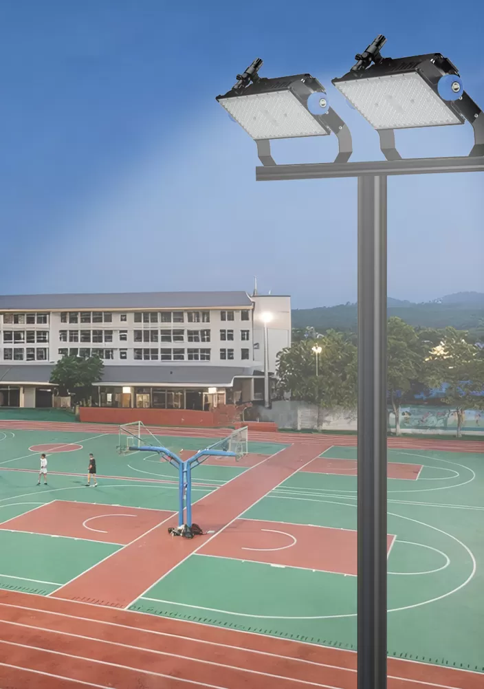 Ang isang simetriko na layout sa magkabilang panig ay perpekto para sa maliit hanggang katamtamang sukat na mga larangan ng multipurpose, tulad ng mga basketball court at maliliit na larangan ng atletiko. Upang maiwasan ang paningin na makagambala sa mga aktibidad ng mga guro at mag-aaral, ang mga lampara ay anggulo sa labas sa isang anggulo ng 10 ° hanggang 15 °, ang taas ng poste ay 8-12 metro, at ang spacing ay 20-25 metro. Maaaring idagdag ang mga low-pole na auxiliary light sa mga naaangkop na lokasyon upang mapabuti ang lokal na pag-iilaw kung ang patlang ay may mahabang pagtalon at mataas na jumno mga seksyon.